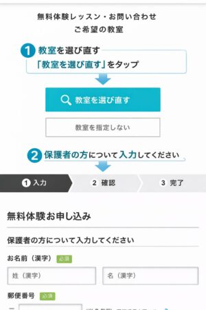 ②画面上の【教室を選び直す】をタップし、お住いの近くの教室を選んで、保護者やお子さまの個人情報などを入力する。