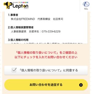 ④【個人情報の取り扱いについて】に同意を読み、問題なければチェック欄をタップ(クリック)してチェックマークを入れる。その後、【お問い合わせを送信する】をタップ(クリック)します。
