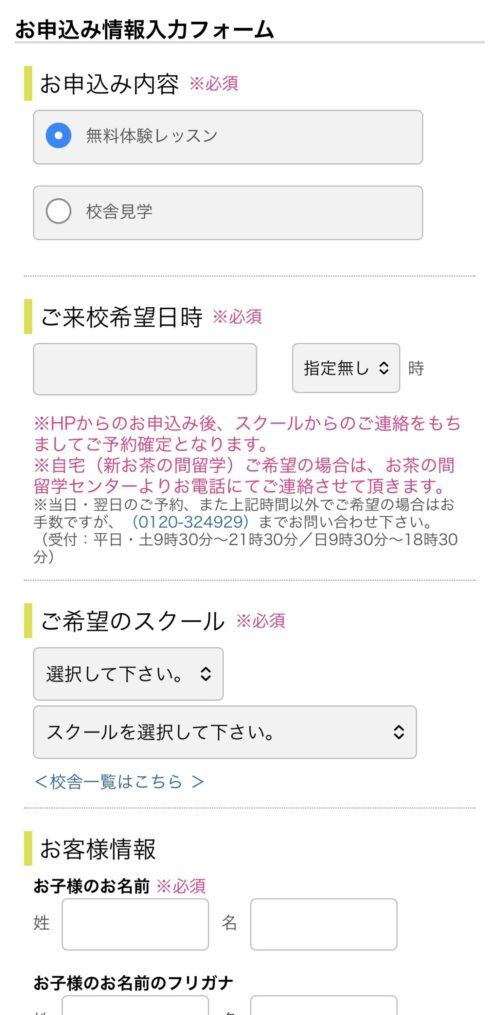 ③申し込みフォームの画面になるので、【無料体験レッスン】を選び、希望の日時やスクール、お子さまの情報などを画面の指示に沿って入力する。
