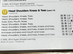 例えば「Head Shoulders Knees and Toes」では、体の部位を指差しながら歌います。